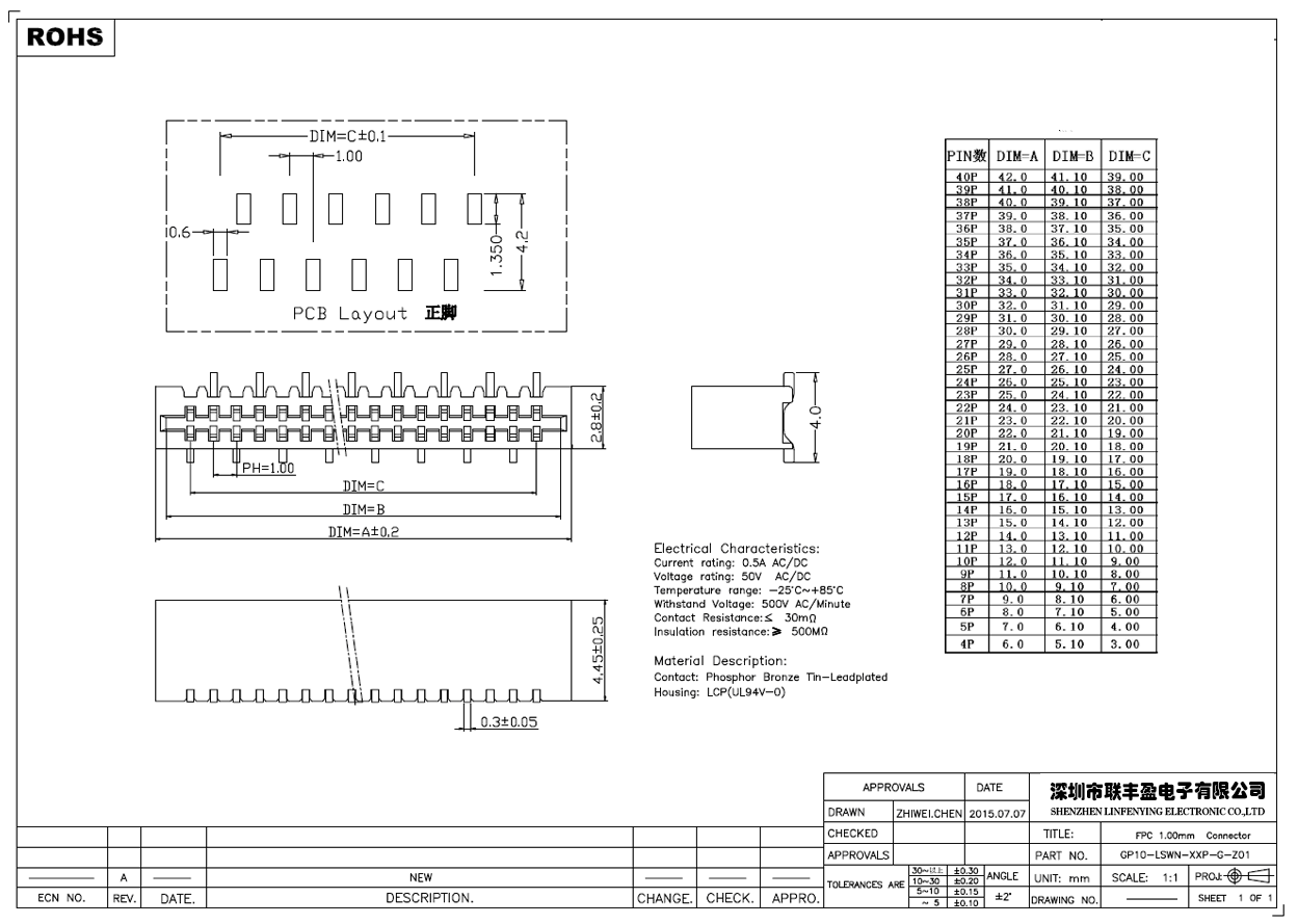 產品簡介品名:FPC連接器規格:立式貼片/180°間距:1.0mm/正向PIN數:4P-40P高度:4.45mm