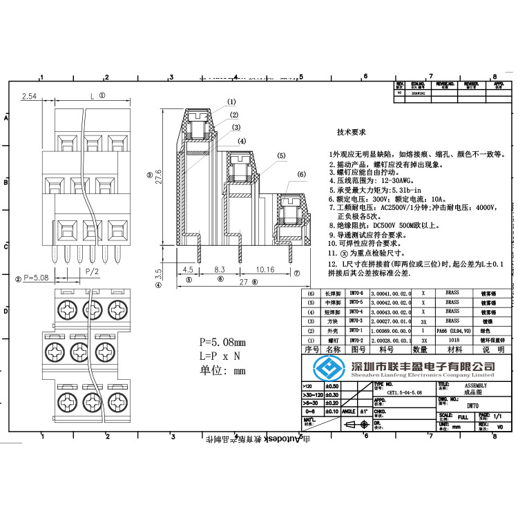 歐式PCB5.08三層接線端子間距螺釘式300V 15A 02P-03P;參考圖紙