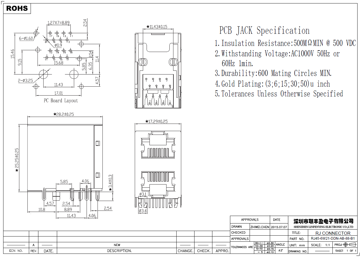 產(chǎn)品簡介品名:RJ45網(wǎng)絡(luò)連接器規(guī)格:臥式插件/90°外殼:帶屏蔽LED燈:無-其它顏色可定制塑膠顏色:黑色