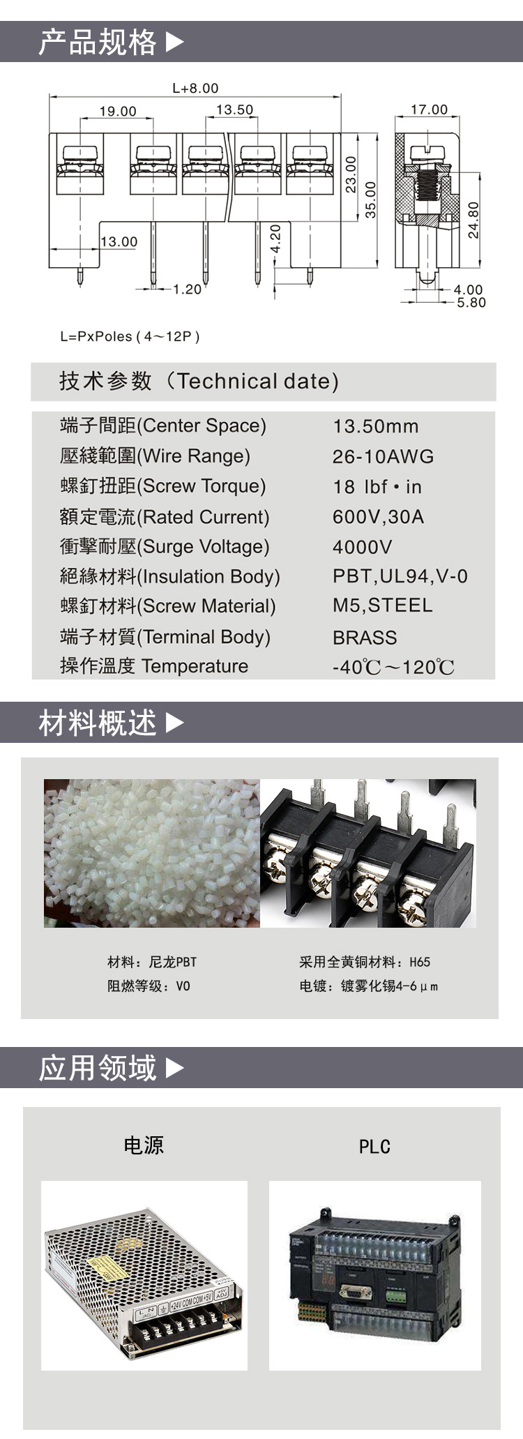 柵欄式PCB接線端子焊腳13.5間距;技術參數